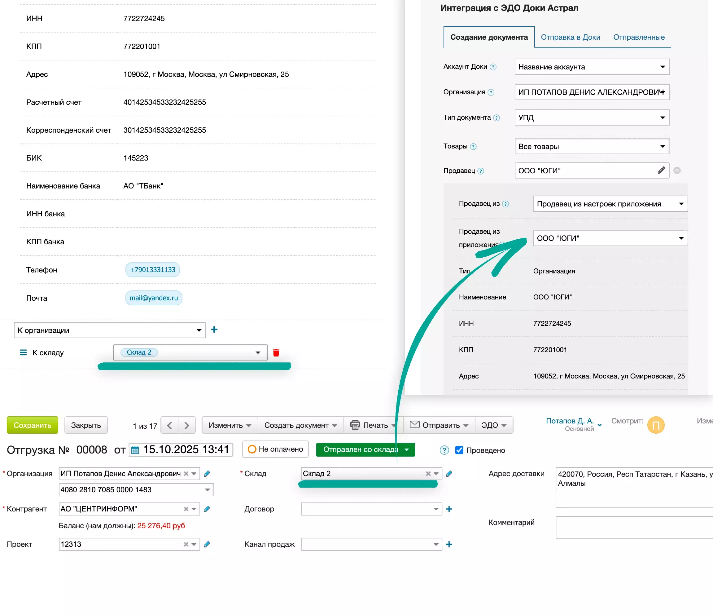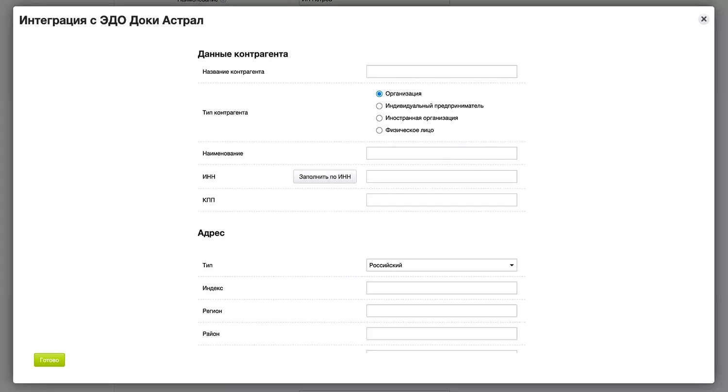 Организация в документенастроек интеграцииКонтрагент в документеКонтрагент в документенастроек интеграцииОрганизация в документеГрузополучатель в документе (только для документа Отгрузка)Организация в документеКонтрагент в документенастроек интеграциинастроек интеграцииВиджет интеграции позволяет создавать документы из Отгрузки, Счета покупателю, Заказа покупателя и Возврата поставщику.