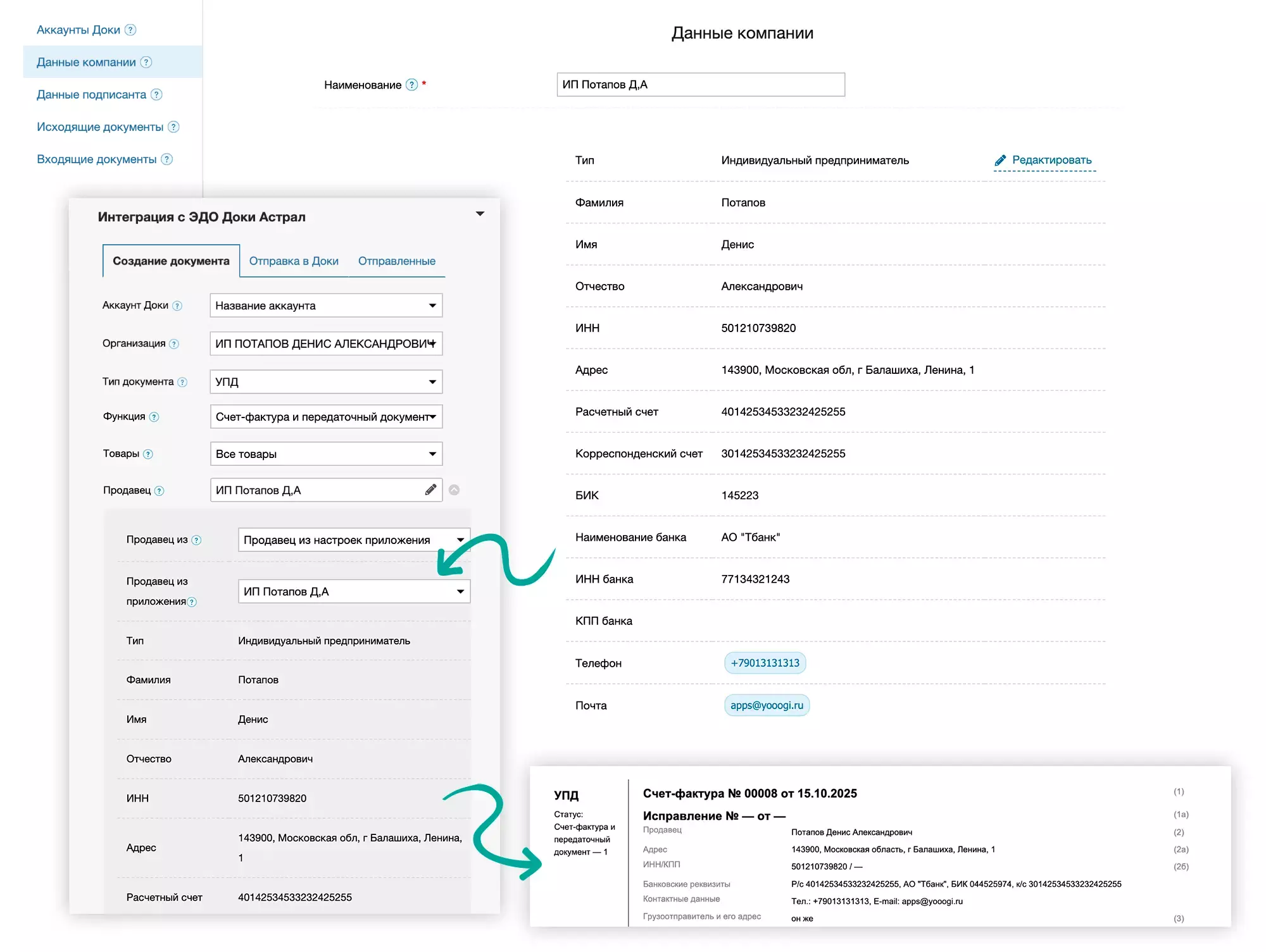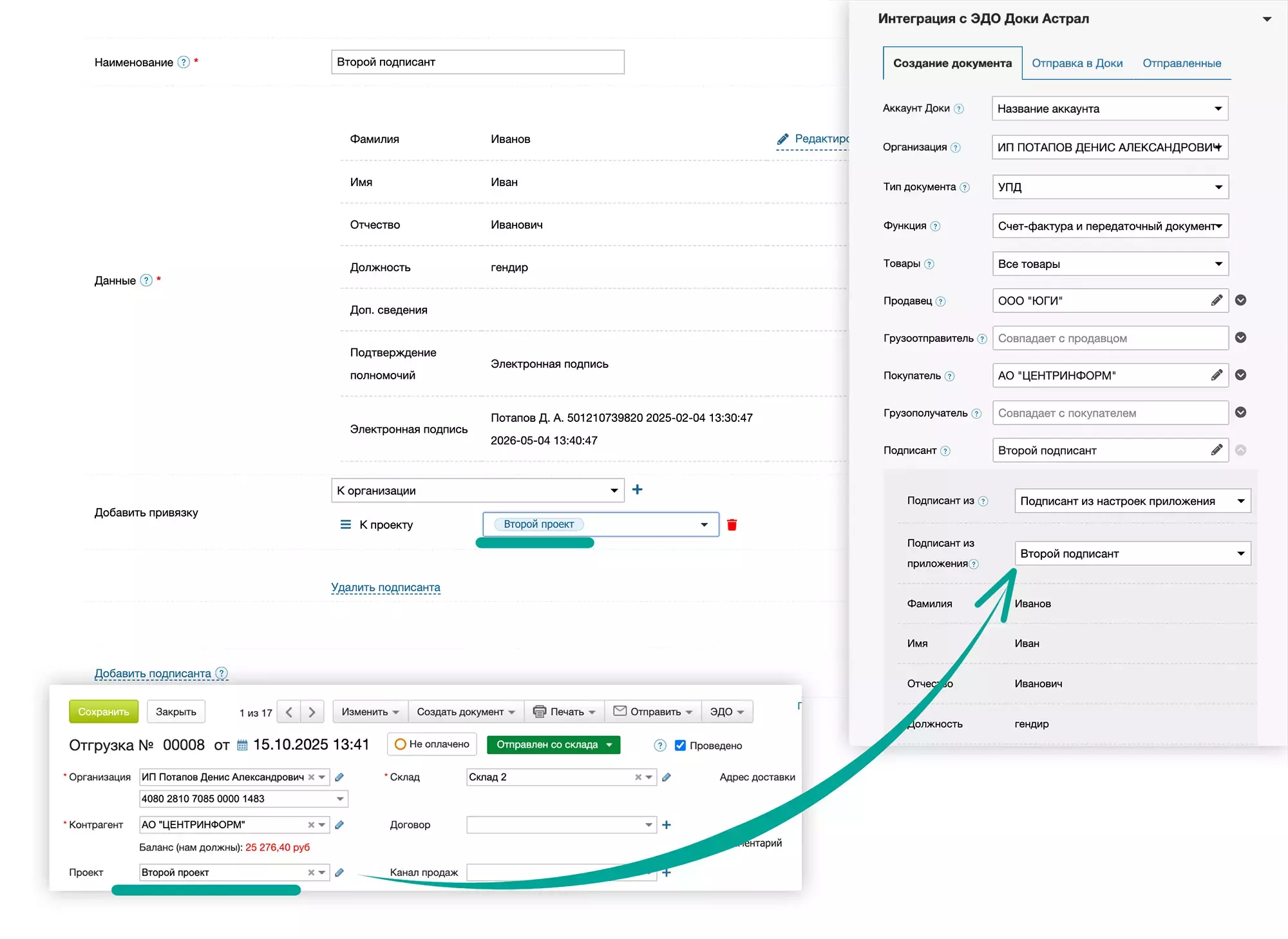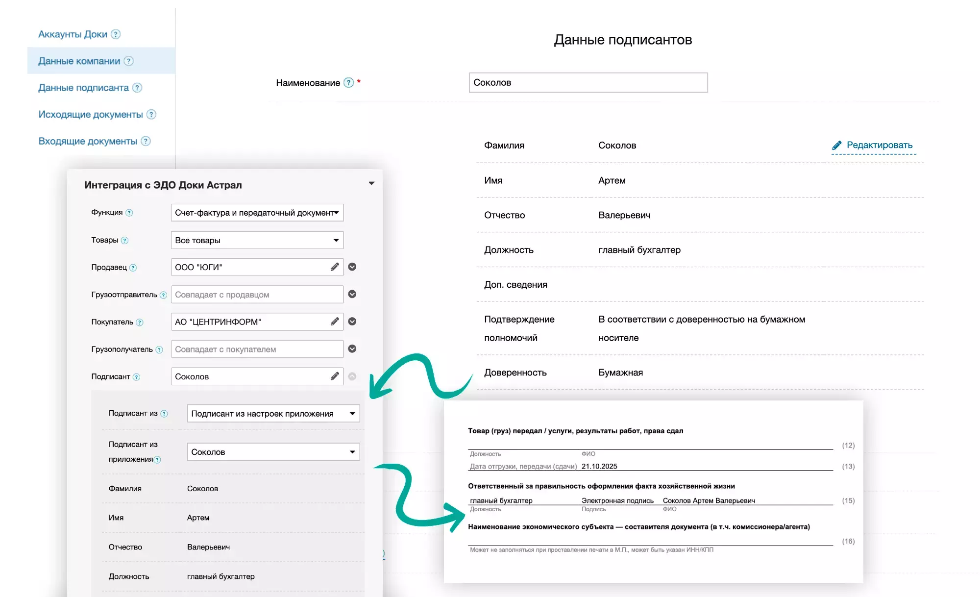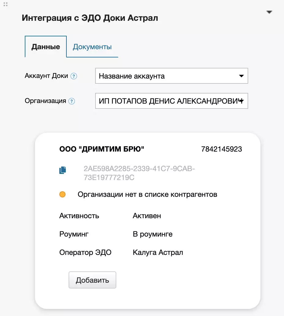 Аккаунт Доки из Настроек интеграции, который будет использован для создания и отправки документа