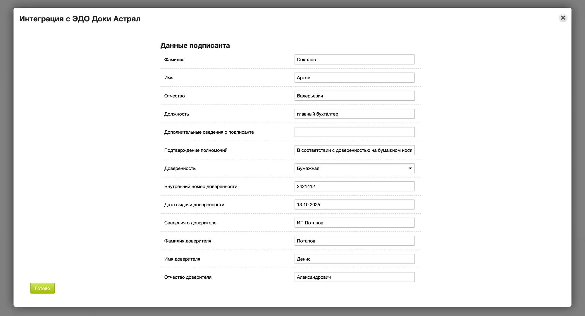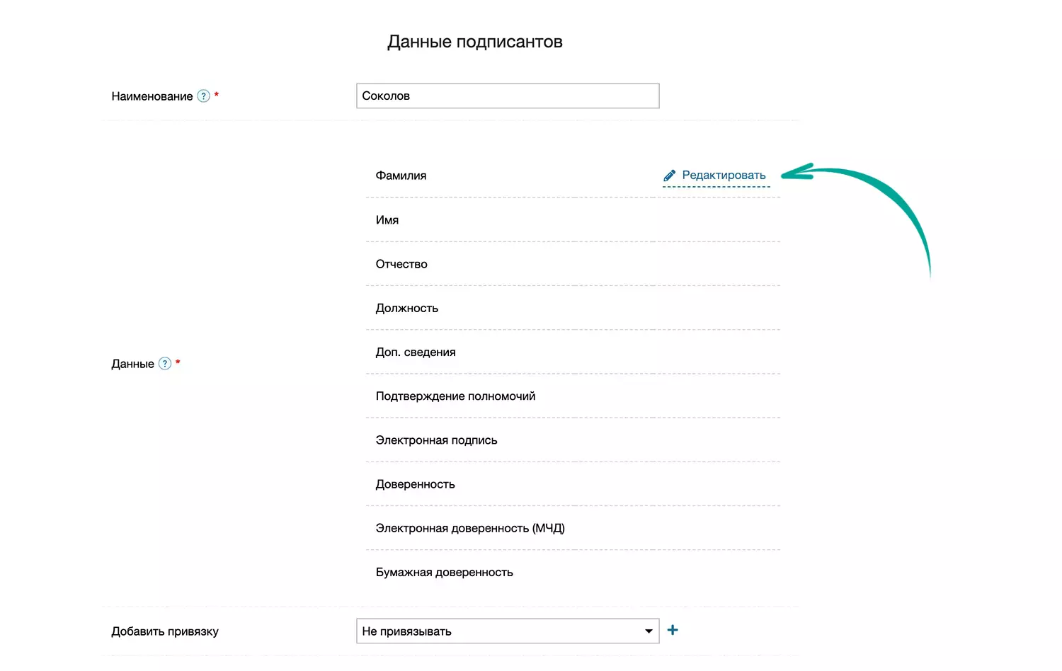 В этом разделе вы можете добавить данные по своим подписантам, которые будут использованы при создании документов в графе Подписант