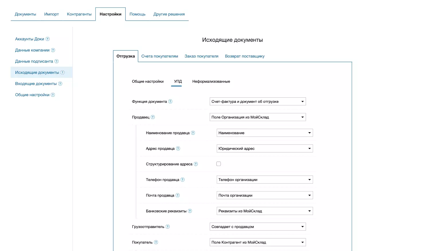 Для каждого типа документа индивидуальный набор настроек. Например: вы можете сделать разные настройки для УПД из Отгрузки и Заказа покупателя.