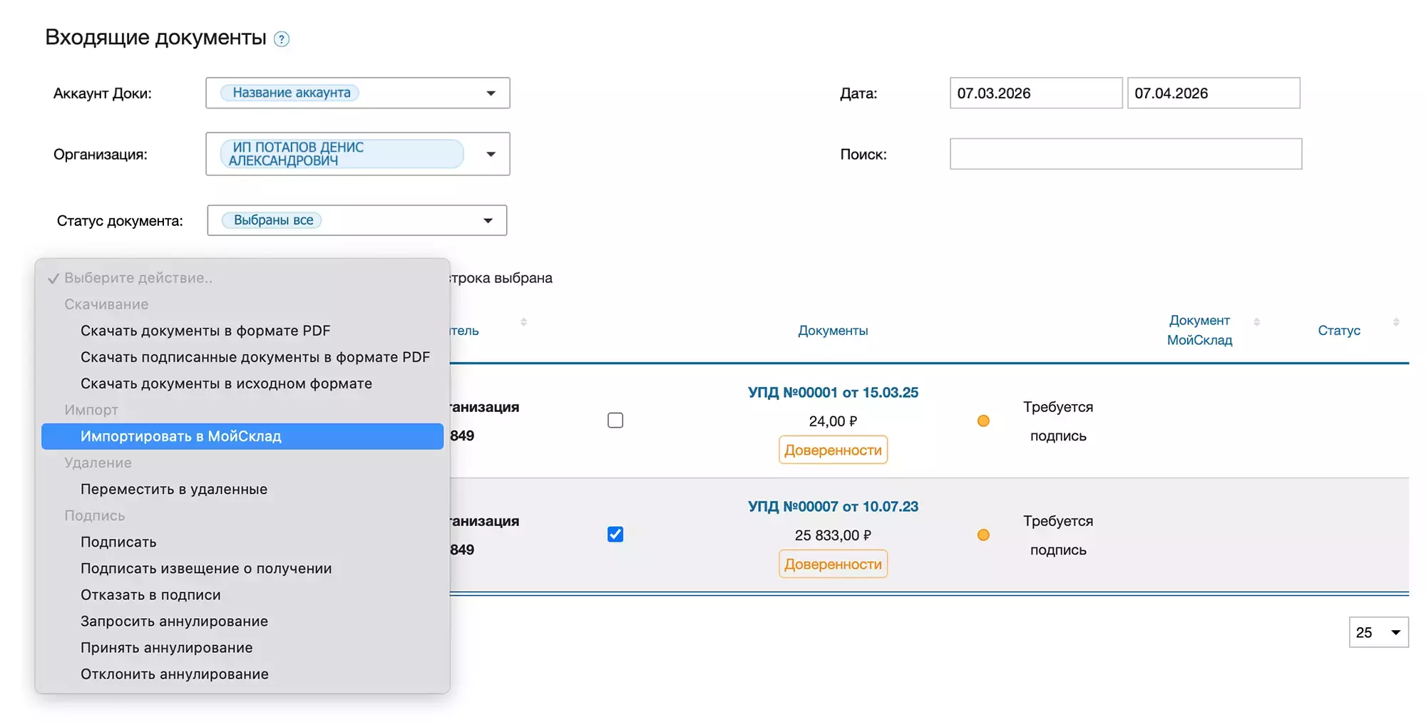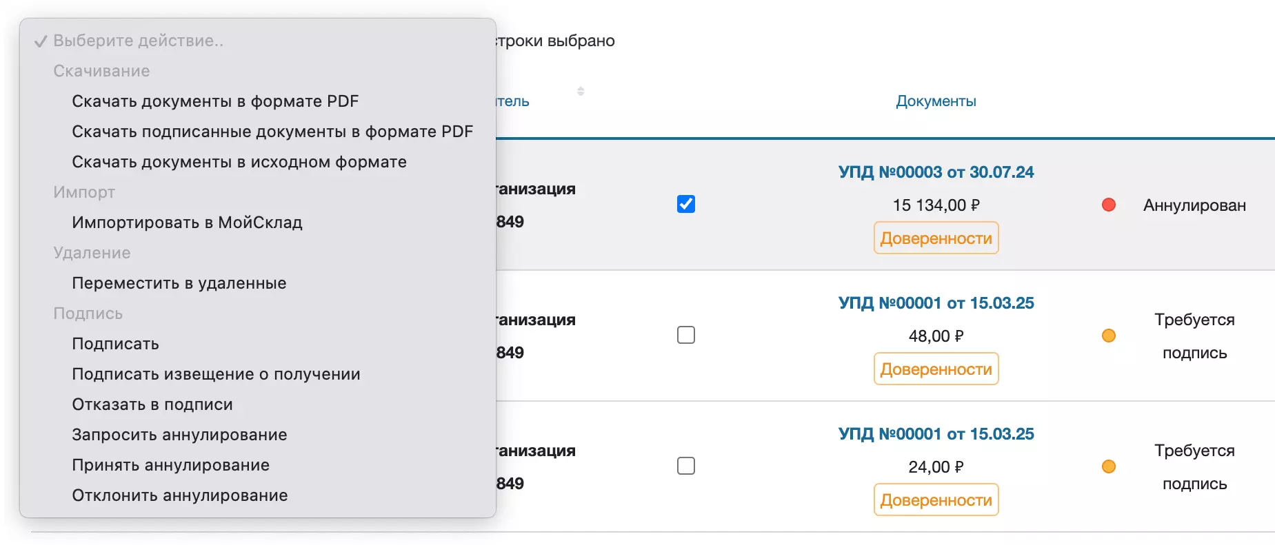 При выделении документов галочкой можно выполнять действия из МойСклад: