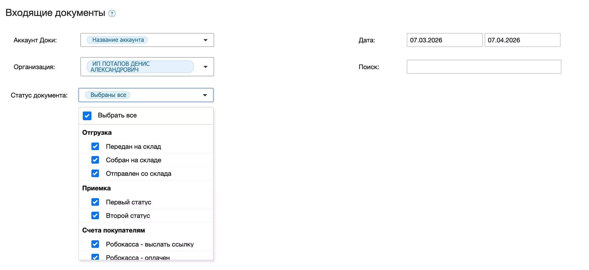 Пользователю доступа фильтрация документов по параметрам: