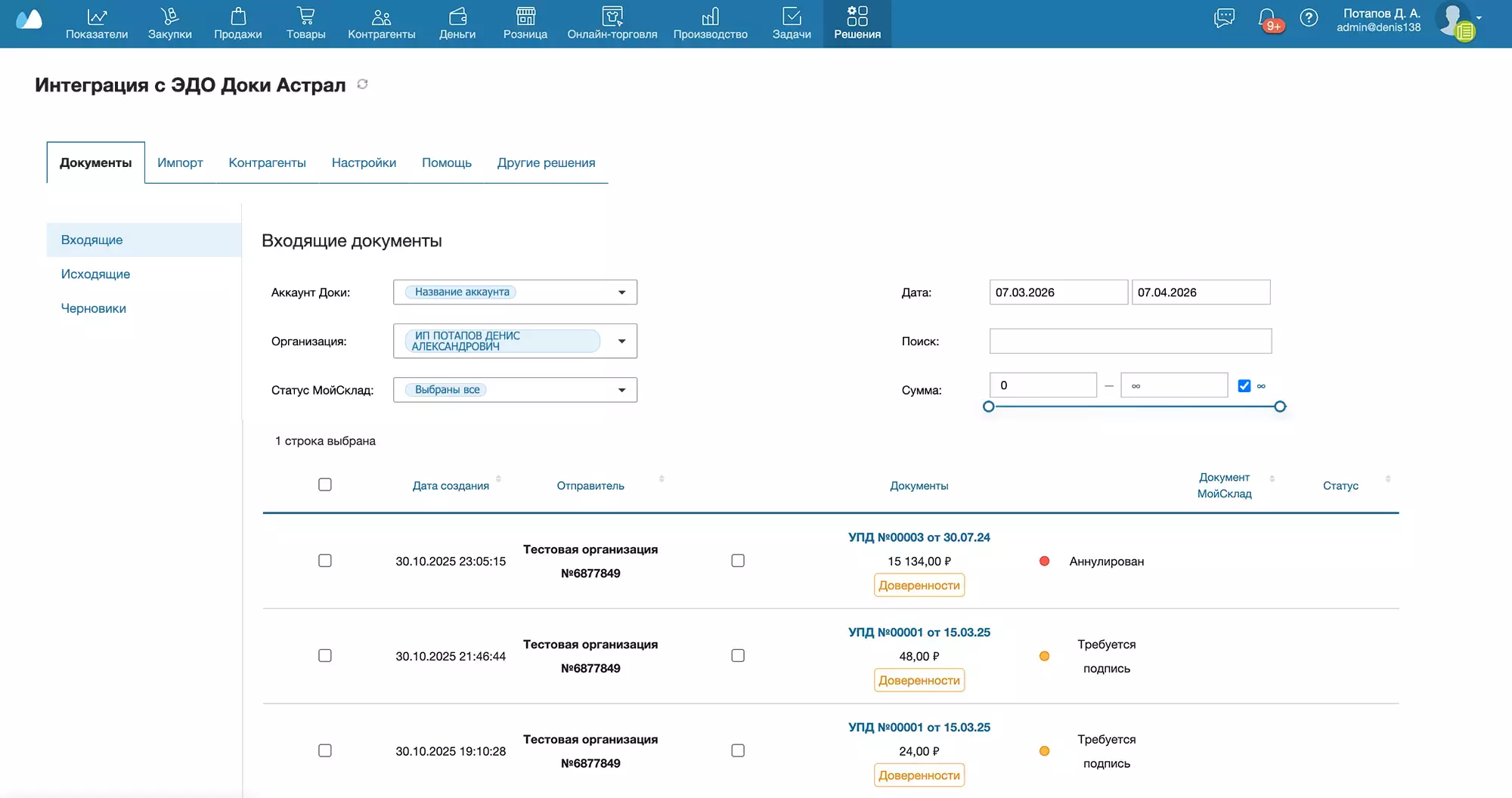 На данной вкладке выводятся все отправленные документы из данного документа МойСклад, при наличии у пользователя соответствующих прав (т.е. выдача не зависит от выбранной организации-отправителя на вкладке Создание документа)