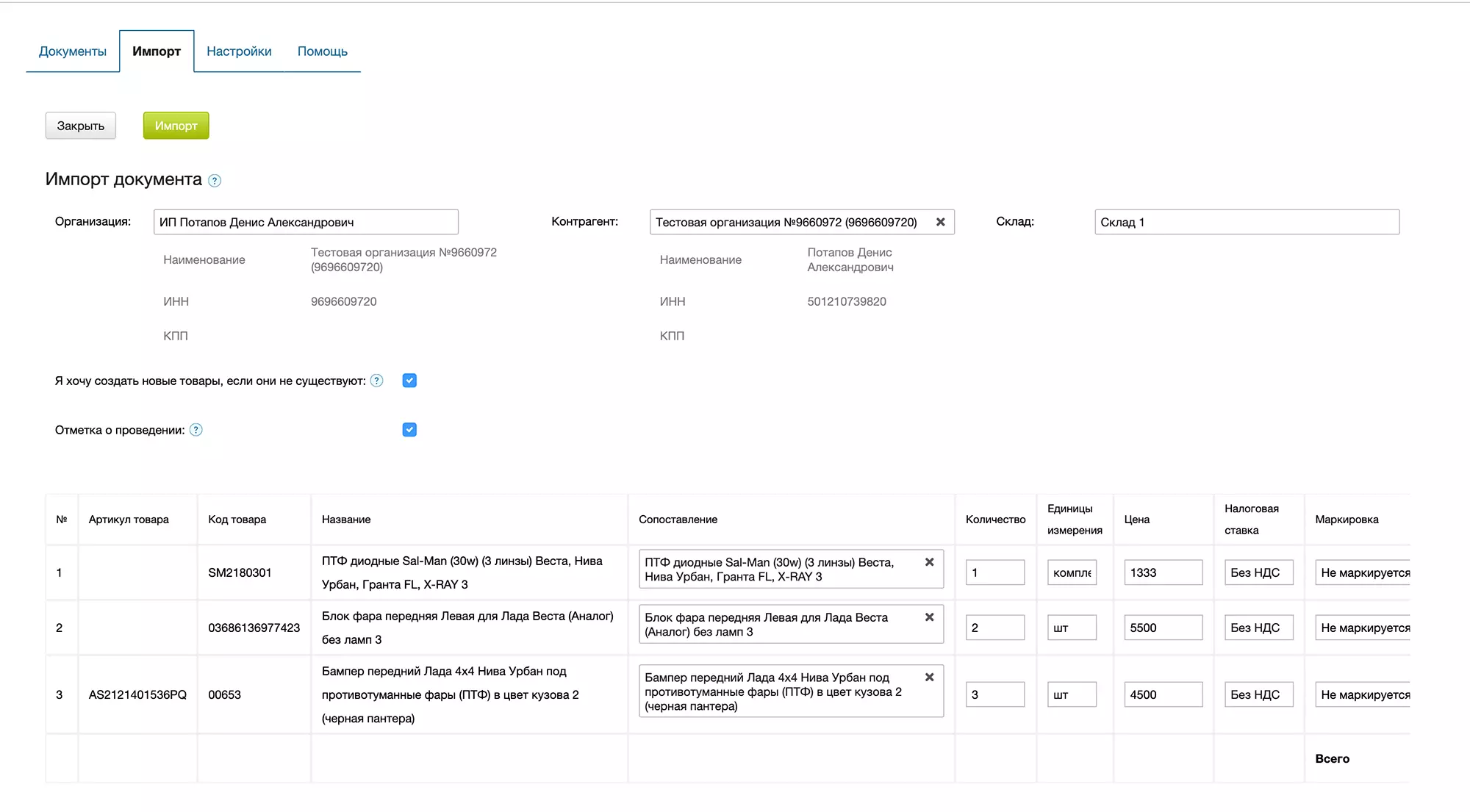 Импорт Сопоставить товары