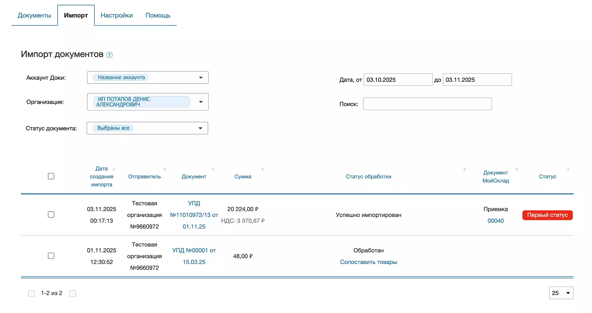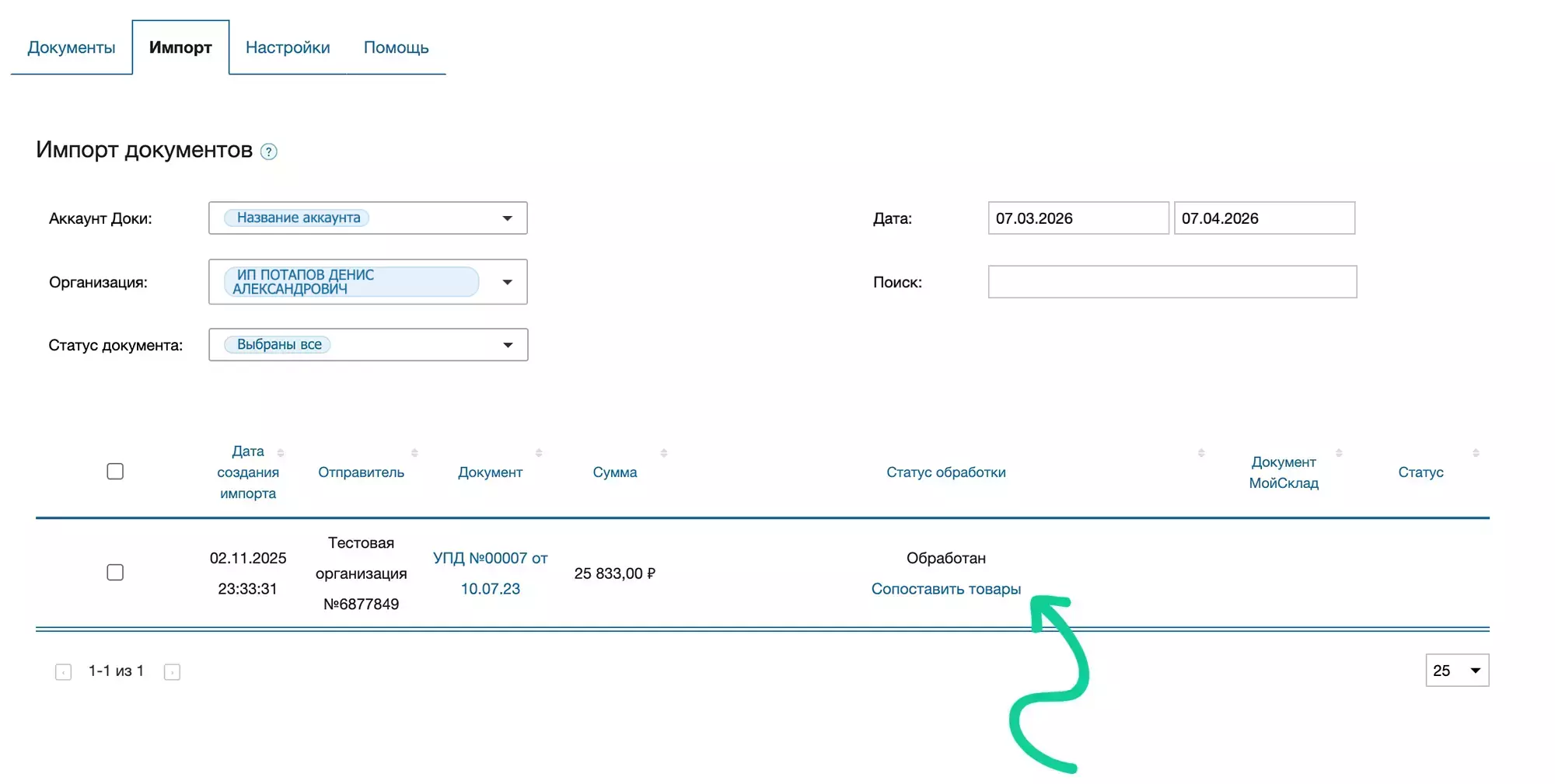 Для импорта документа в МойСклад: