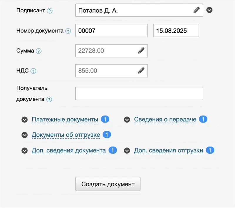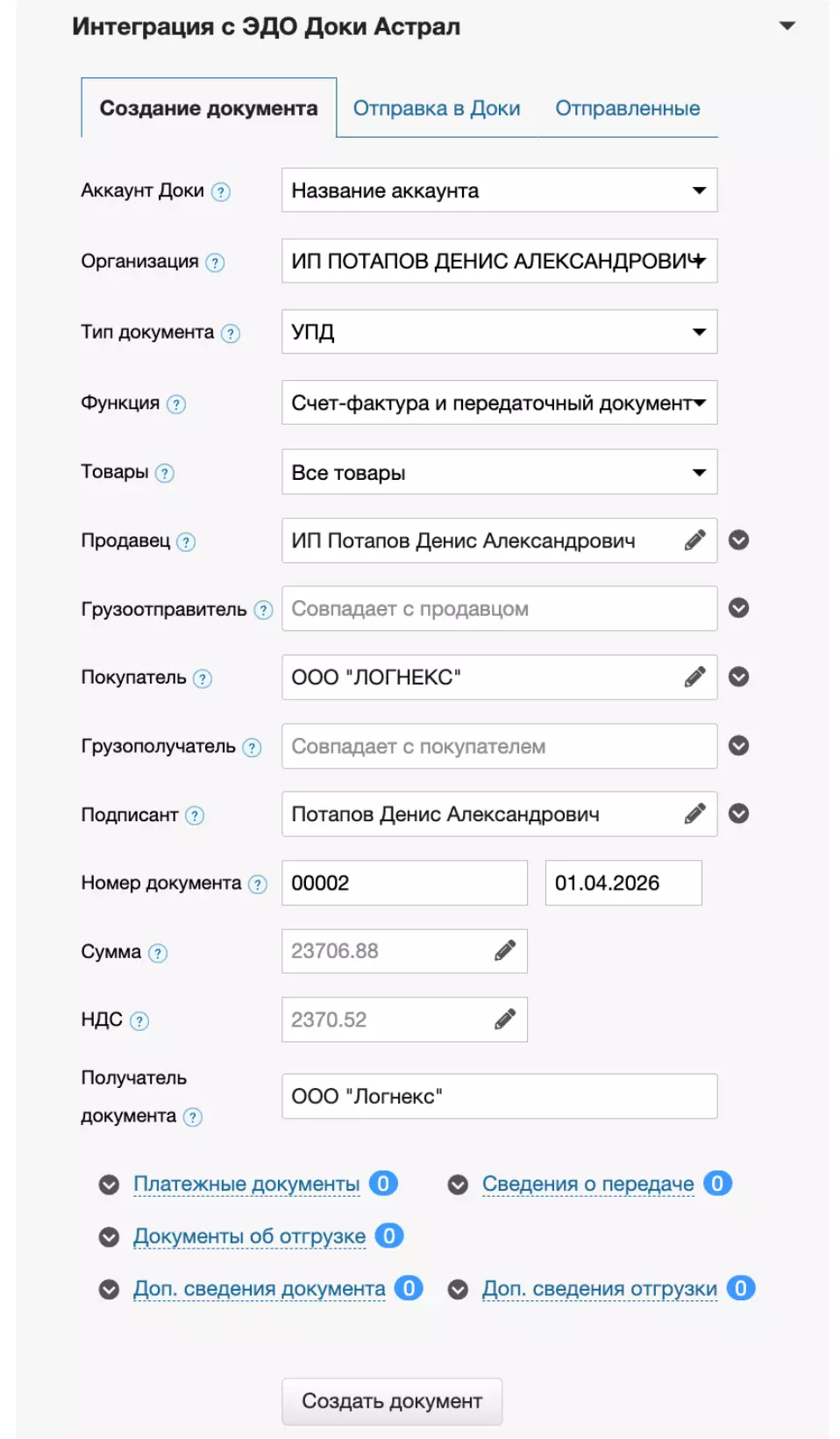 После заполнения полей нажмите кнопку Создать документ