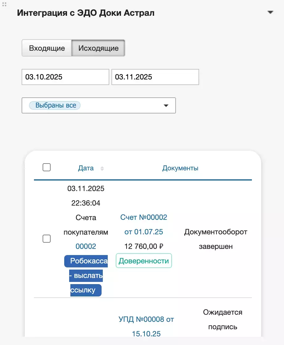 После подписи документа в МоемСкладе или Доки, документ перемещается на вкладку Отправленные