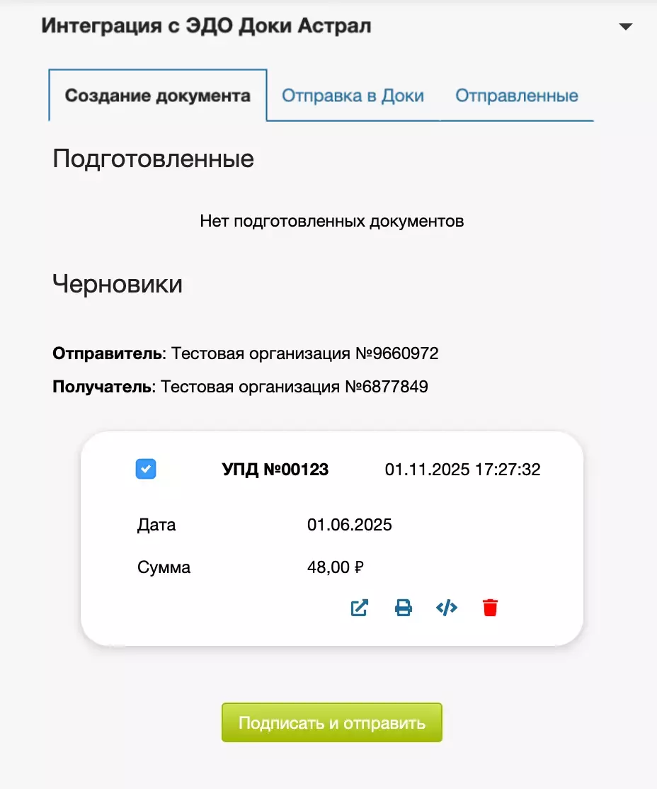 Созданные документы отражены во вкладке Отправка в Доки