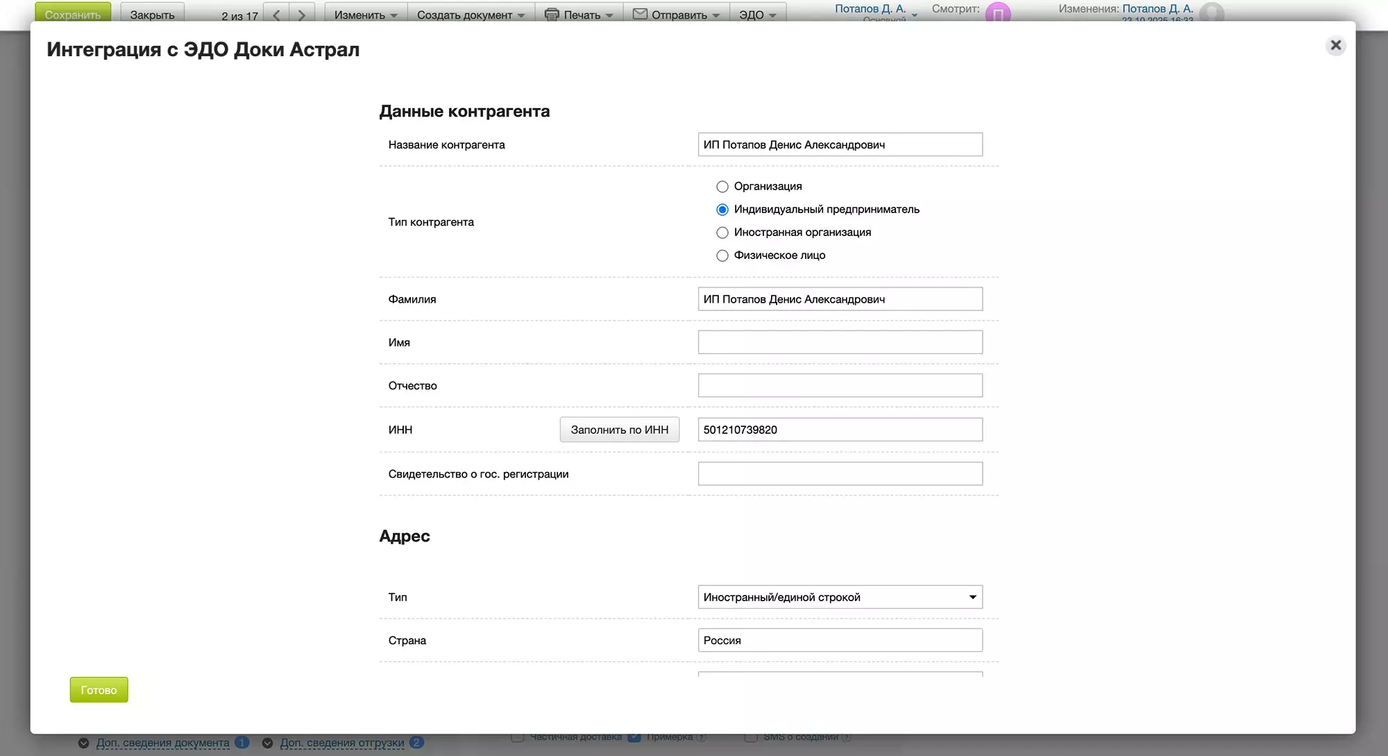 Если у контрагента задан ИНН в карточке МойСклад, интеграция отобразит статус отношений с ним