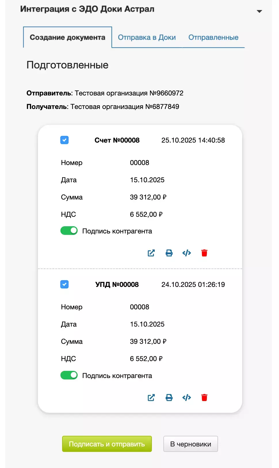 После размещения документа в Черновиках, вы можете подписать его из МойСклад или из Доки