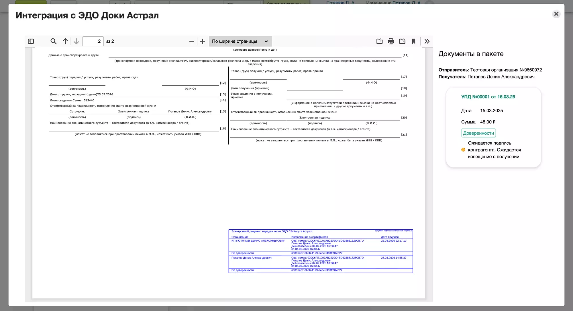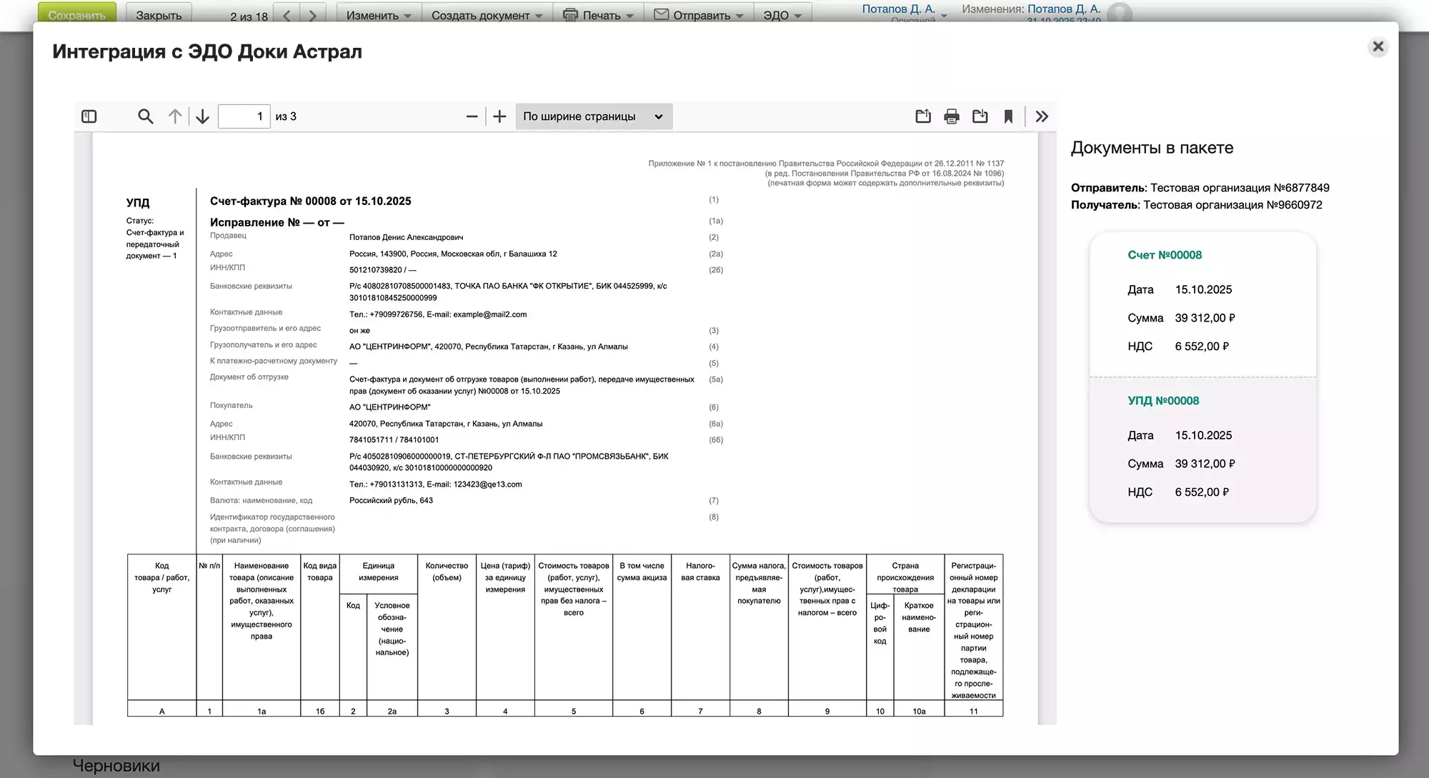 Документы для одного получателя сразу формируют пакет.