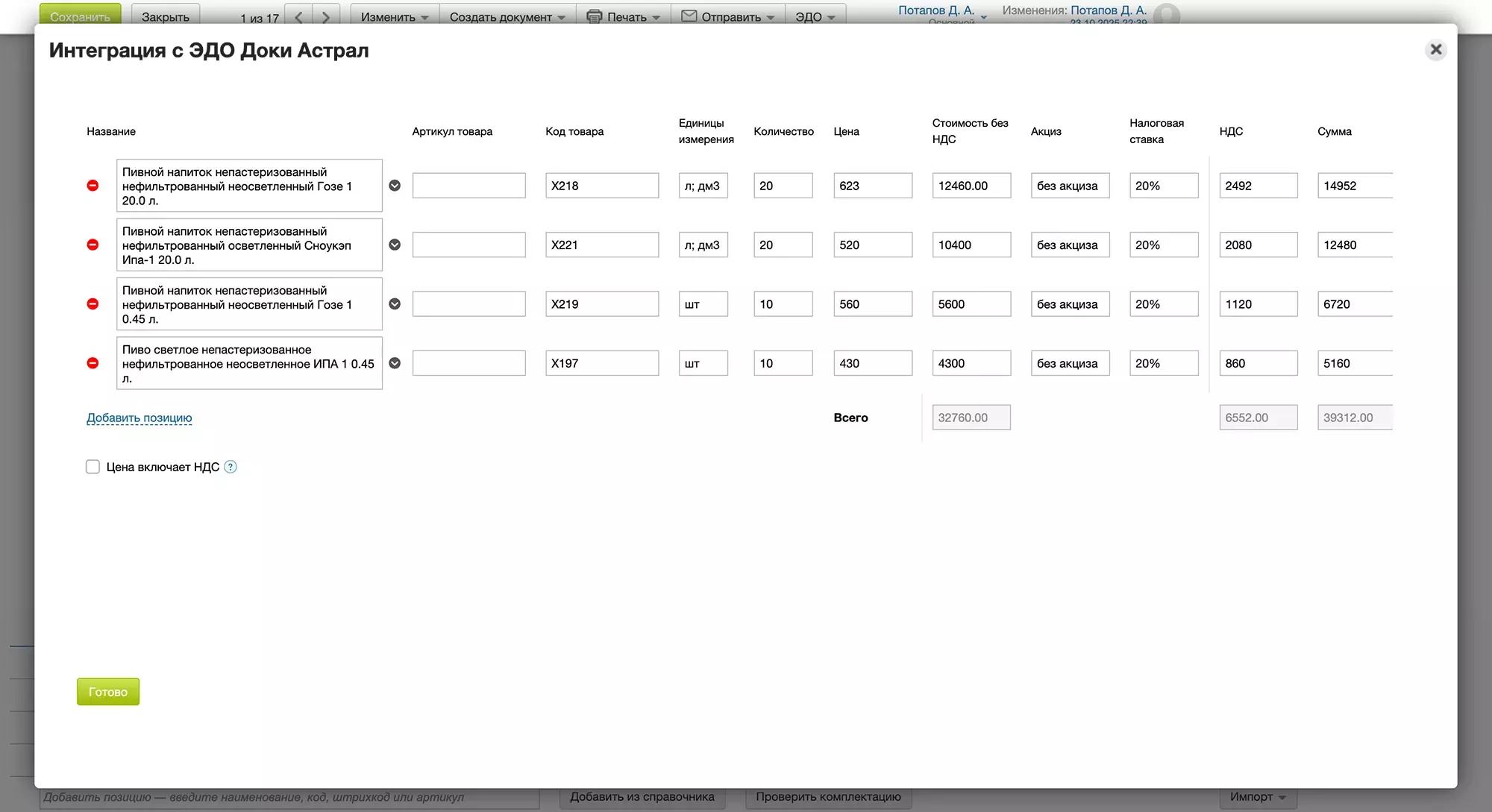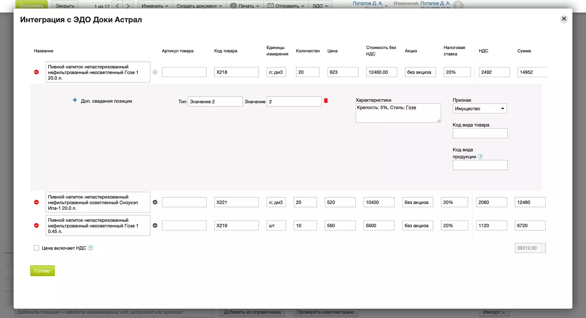 Вы можете дополнительно отредактировать доп. сведения каждой позиции, нажав на иконку