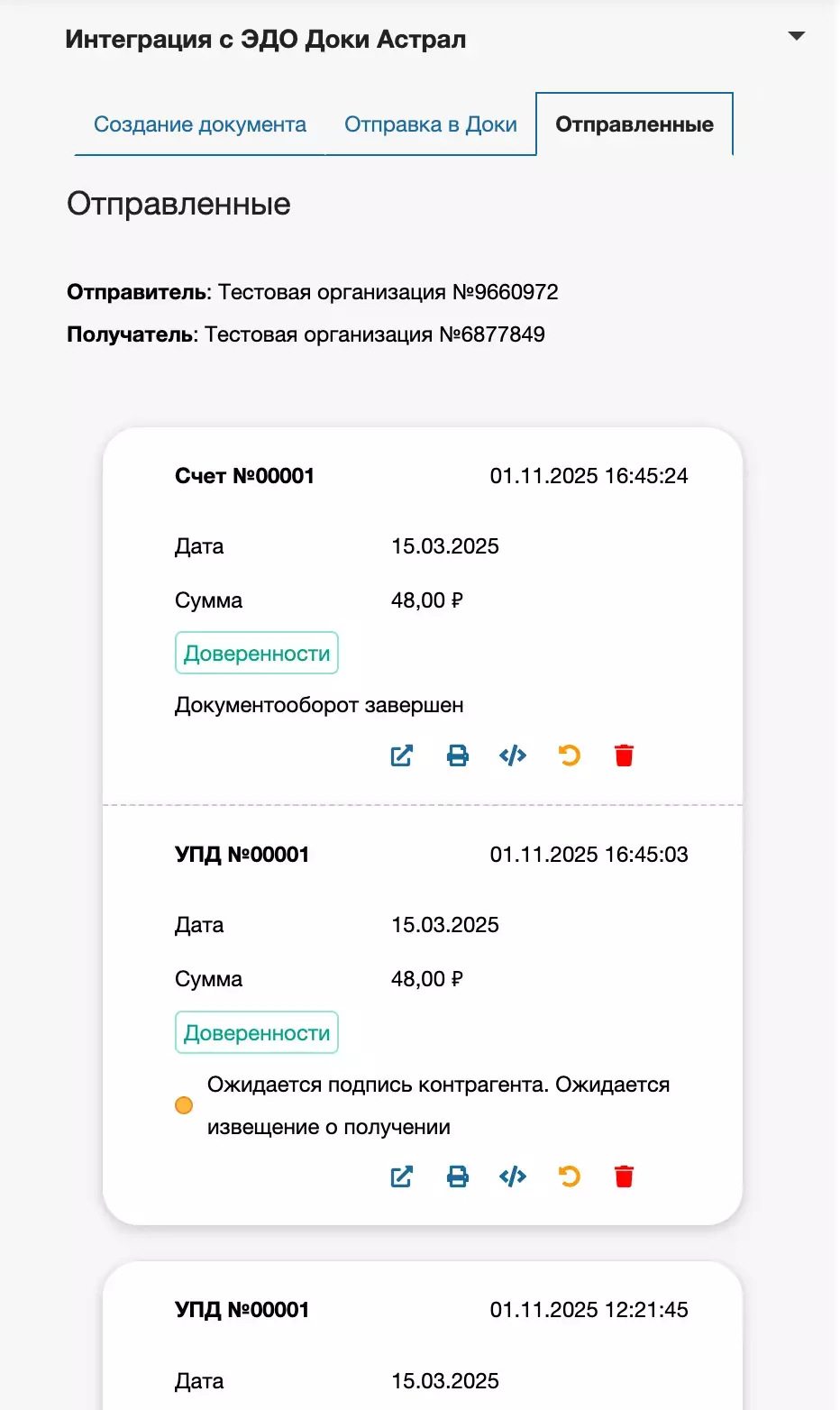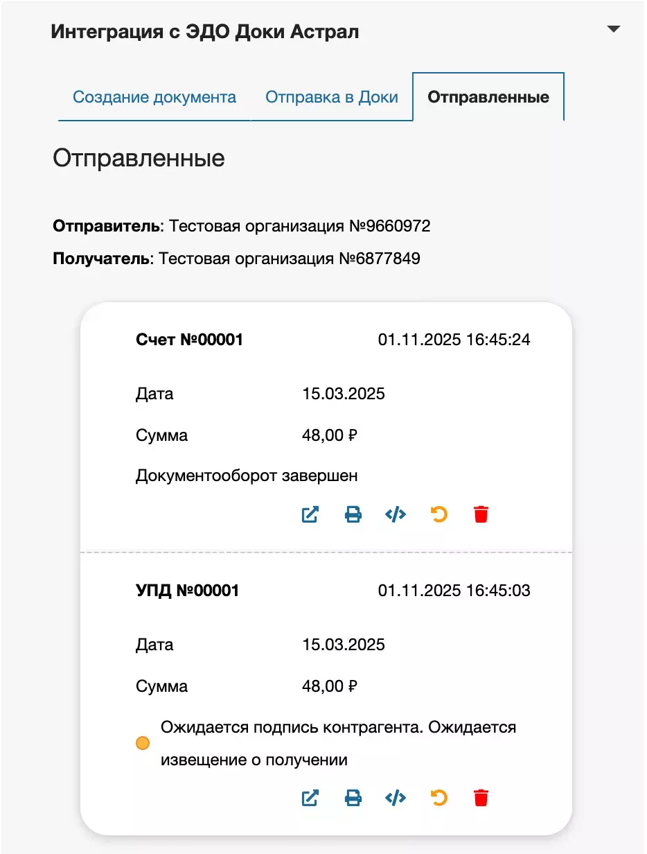 Для отправленных документов доступны следующие действия, при нажатии на соответствующую иконку: